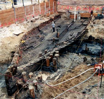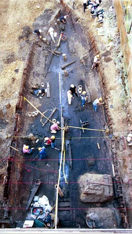 starting at the sternpost and continuing to the building at the west, under which the bow of the ship still lays buried.